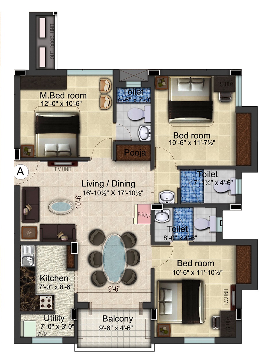 - BEDROOM & SIT-OUT : Hard wood frame with flush shutters